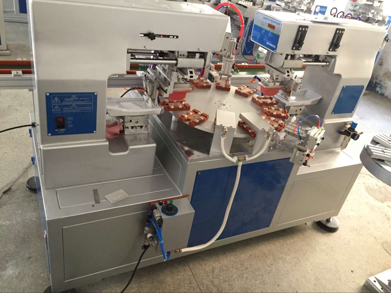 1、 印刷速度比轉(zhuǎn)盤機慢,但印刷工件可以大一些,四個顏色一次套色印刷完成。